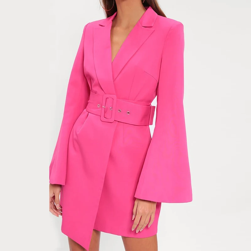 Neon pink Flare Sleeve v Neck Formal Mini blazer Dress Office Women Dresses 2020